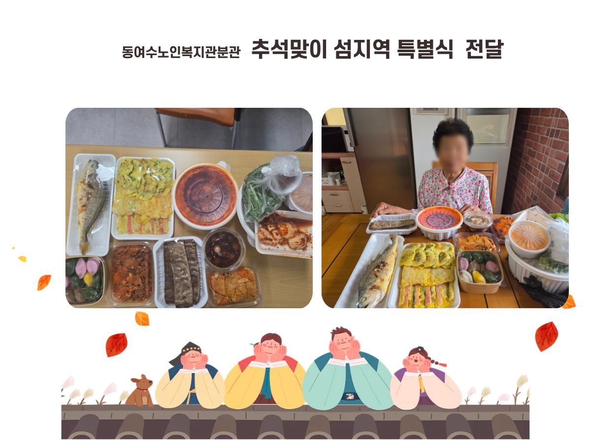 동여수노인복지관분관에서는 섬 지역 독거어르신들에게 밑반찬과 함께 추석맞이 특별식(모듬 전세트, 생선구이, 모시송편 등)을 전달했습니다. 아울러 지역의 따뜻한 정성이 담긴 다양한 후원품(국밥세트, 보조의료품, 롤티슈 등)도 함께 전달되어 더욱 푸짐하고 넉넉한 명절 선물이 되었습니다.