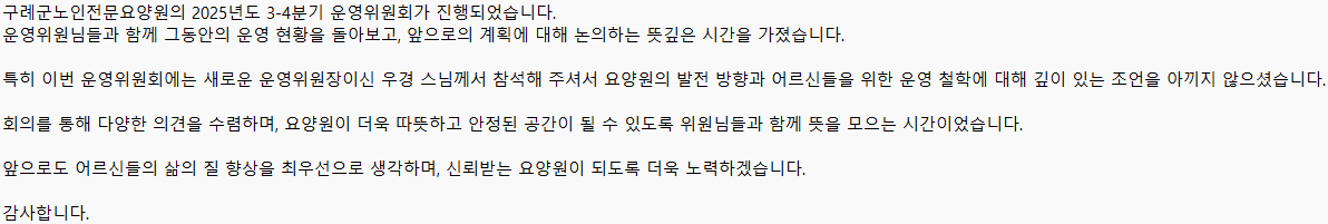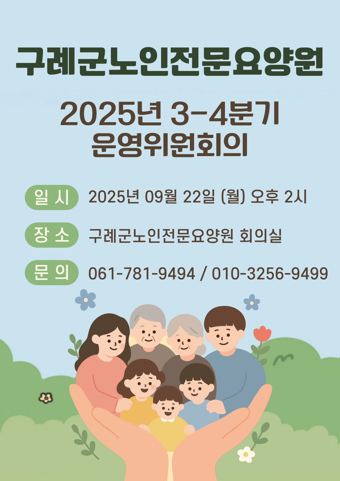 [구례군노인전문요양원] 25년 3-4분기 운영위원회의 페이지 정보 작성자 보문복지회 작성일25-09-22 15:39 조회35회 댓글0건 본문 댓글목록 등록된 댓글이 없습니다. 이전글 다음글 목록