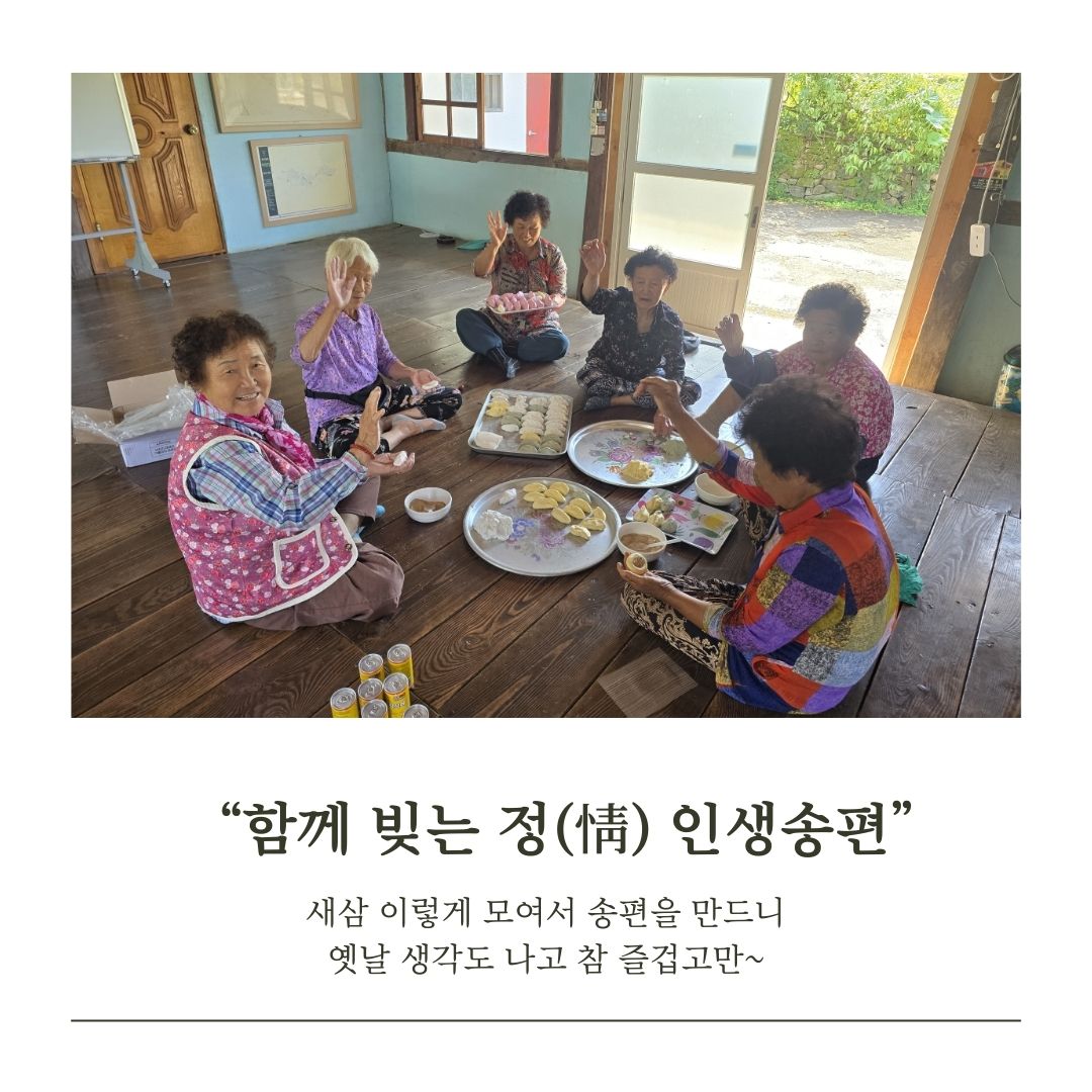 마을회관은 이른 아침부터 고소한 햅쌀가루와 솔잎 향으로 가득 찼고 참여한 어르신들은 젊은 시절의 기억을 떠올리며 익숙한 솜씨로 반죽을 치대고, 깨와 콩, 밤 등 다채로운 소를 넣어 복스러운 모양의 송편을 빚어냈습니다.