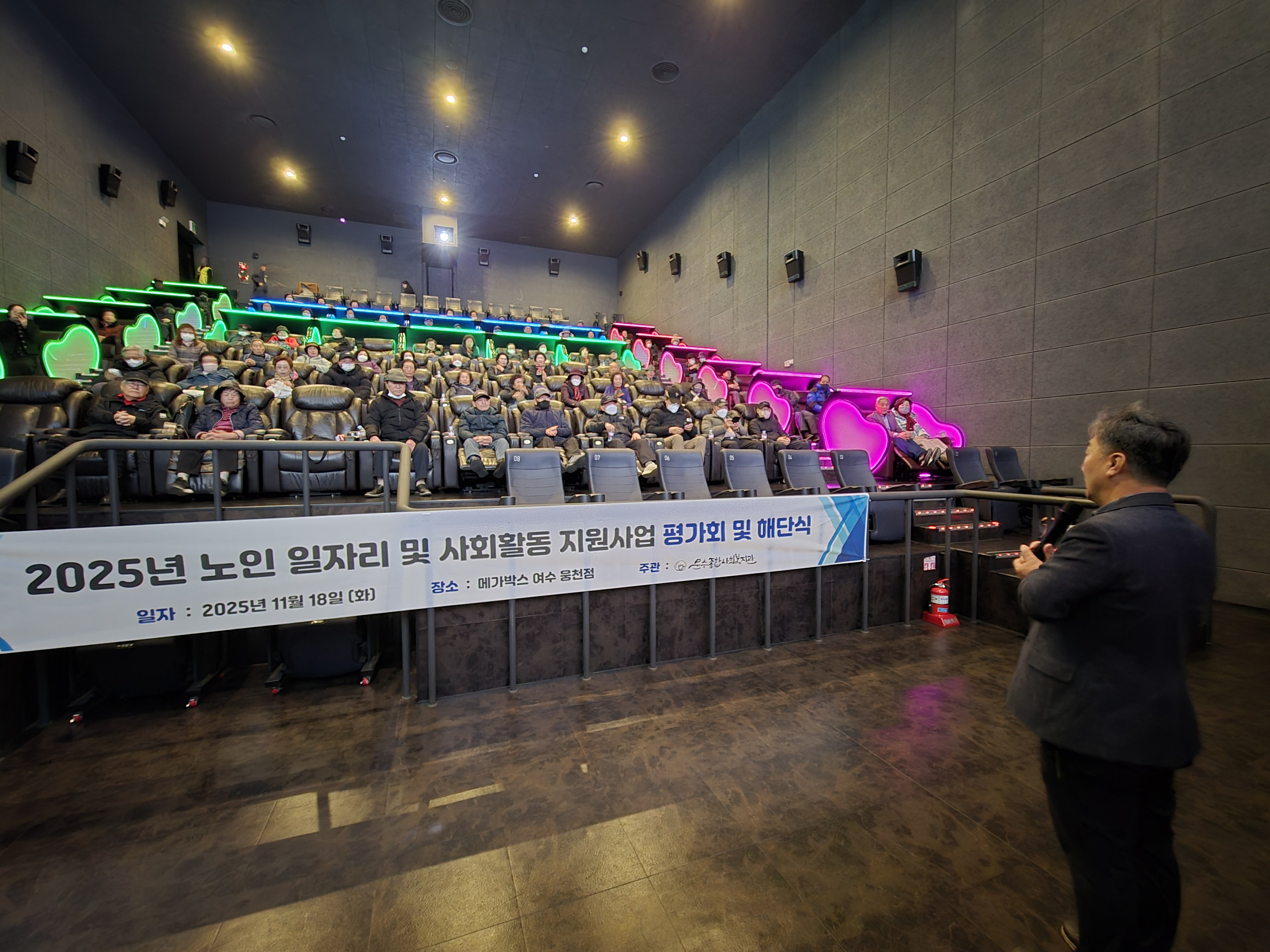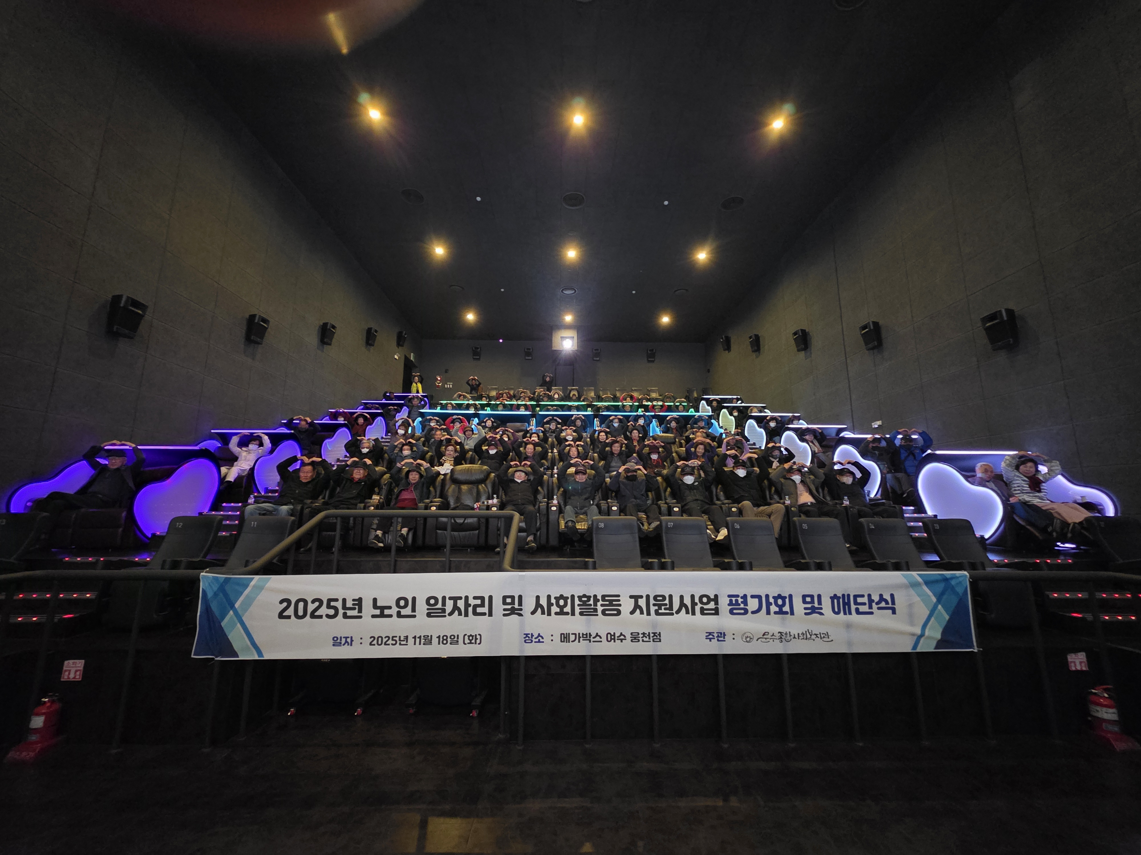 | 문수종합사회복지관에서는 일자리에 성실히 참여한 참여자의 노고를 취하하고자 11월 18일 [ 2025년 노인 일자리 및 사회활동 지원사업 평가회 및 해단식] 을 웅천 메가박스에서 진행했다. 2025년 문수종합사회복지관 노인일자리 및 사회활동 참여자는 320명으로 공익형 3사업단, 사회서비스형 2사업단을 성황리에 종료했다. 2025년 사업단별 사업 평가와 2026년 사업 안내 및 영화 상영을 준비하며, 한 해 동안의 성과를 되돌아보고 그간 수고해주신 어르신들의 노고에 대해 감사의 마음을 전했다. 참여자 이**(공익활동형) "노인 일자리 참여로 생활비를 마련 할 수 있어 경제적 도움이 되고 ,건강 개선도 되었다고 내년에도 꼭 노인일자리 참여를 하고 싶다" 라며 말했다. 참여자 분들 모두 노인 일자리를 통해 즐겁고 보람찬 한 해였다며 소감을 밝혀주셨고 내년에도 또 만나 뵙기를 희망했다. 2025년 문수종합사회복지관 노인 일자리 및 사회활동 지원사업 신규 참여자 접수는 2025년 11월 27일 부터 12월 5일 까지다. 공익활동형 275명, 역량활용형 30명을 접수할 예정이다 |