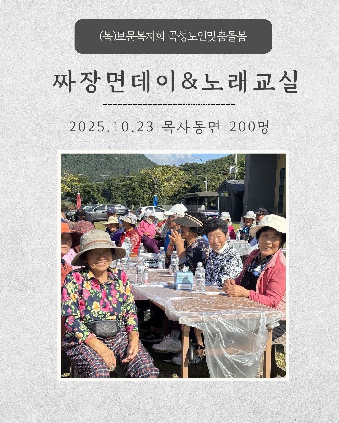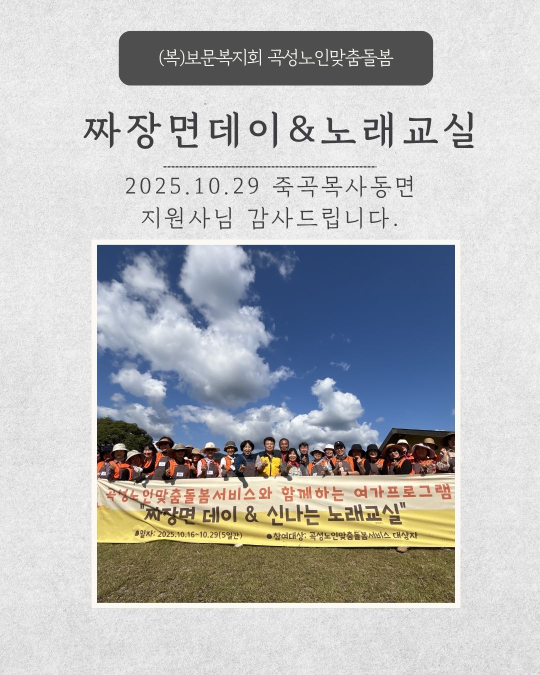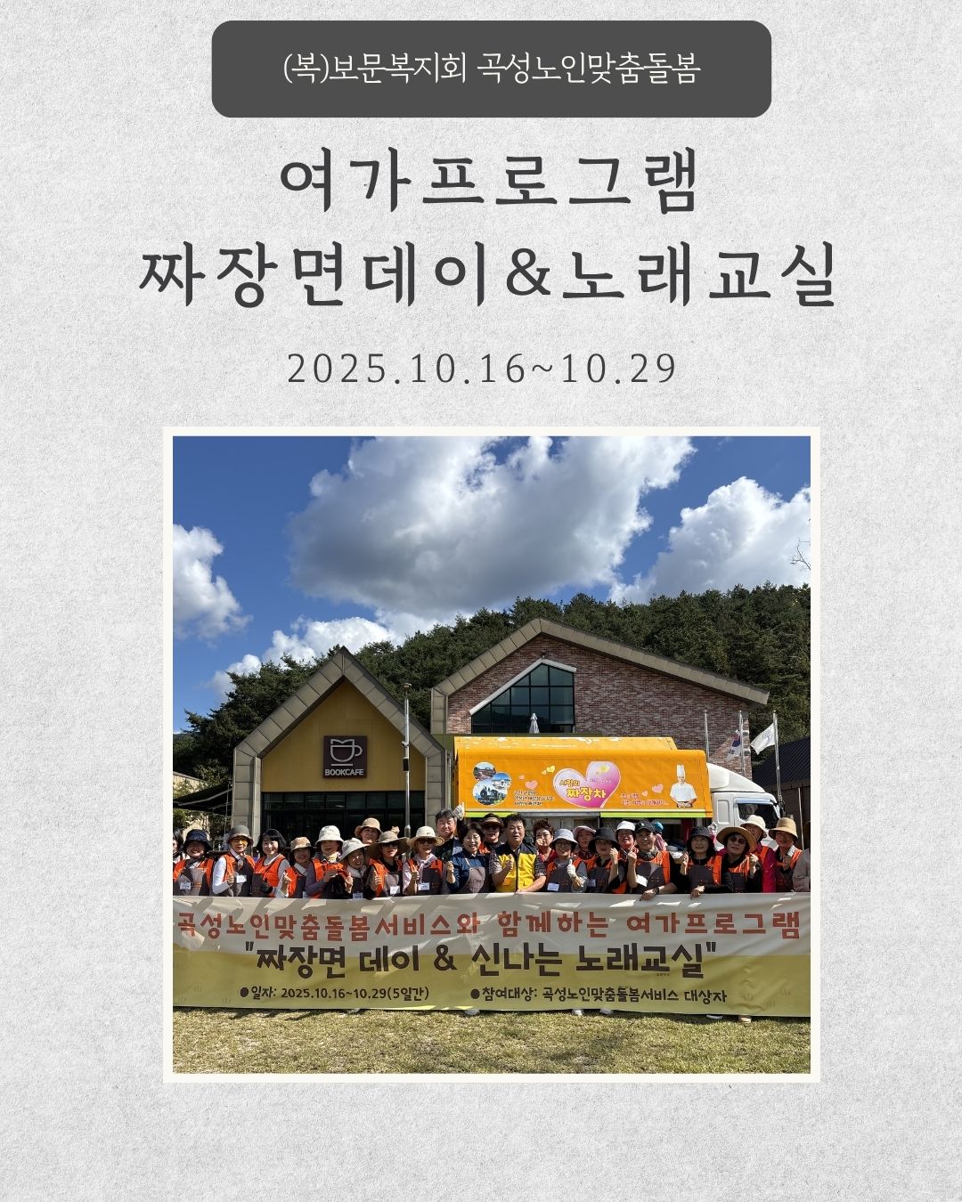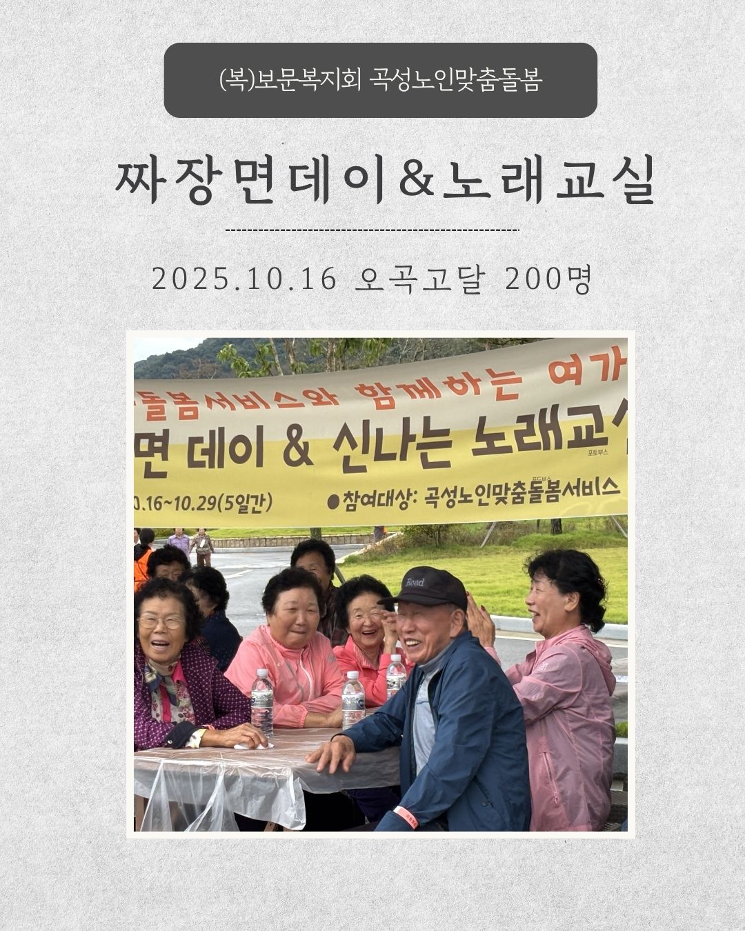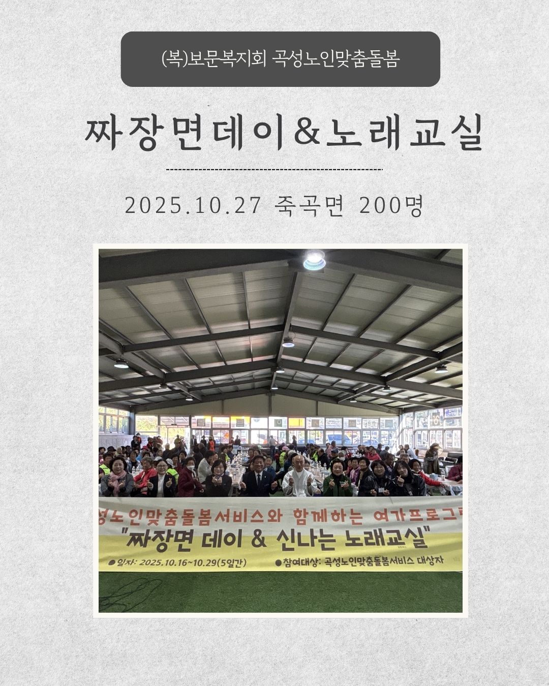 곡성노인맞춤돌봄 수행기관(센터장 손인자)이 주관한 '짜장면데이 & 노래교실' 여가 프로그램이 총 5회차에 걸친 릴레이 순회 행사로 진행돼,