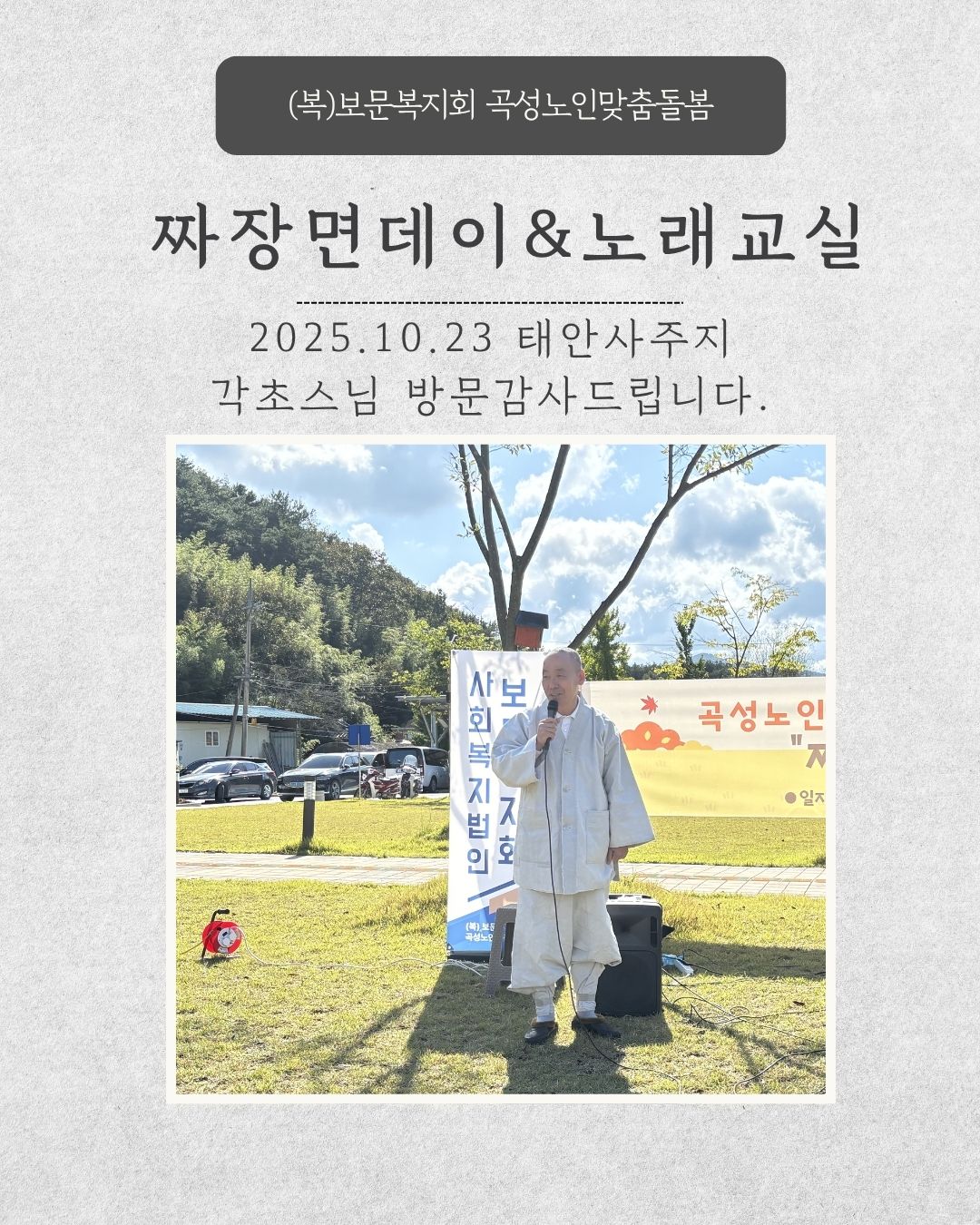 사회복지법인 보문복지회(이사장 향일암 주지 연규스님)와 곡성의 정신적 지주인 태안사 주지 각초스님과 도림사 주지 우범스님은, 어르신들에게 따뜻한 식사 한 끼를 대접하고 싶다는 행사의 취지에 깊이 공감하며 1,500인분의 짜장면 나눔이 성사될 수 있도록 물심양면으로 아낌없는 후원을 보냈다.