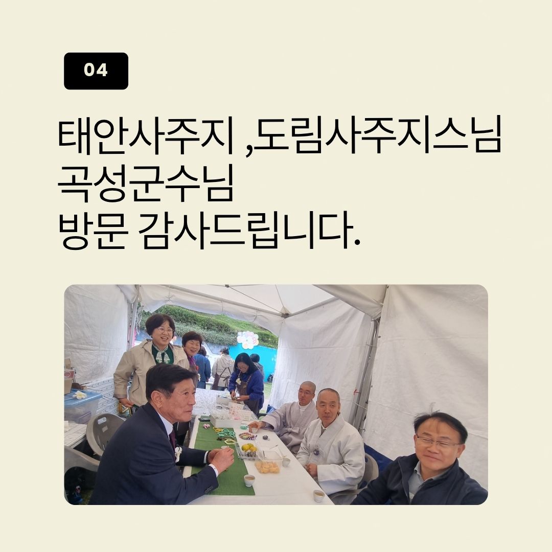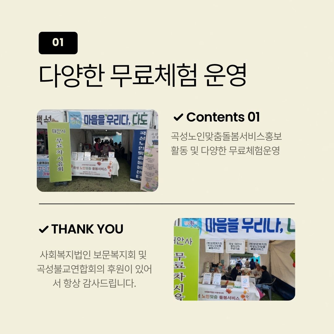 곡성 노인맞춤돌봄 후원사찰인 태안사주지 각초스님, 도림사주지 우범스님께서는 "축제 기간 동안 많은 분들이 저희 부스를 찾아주셔서 감사하다. 노인맞춤돌봄 서비스는 단순히 어르신 한 분을 돌보는 것을 넘어, 온 마을이 함께 어르신들을 존중하고 보듬는 문화를 만들어 가는 것"이라며, "앞으로도 이처럼 지역사회에 스며들어 기관 홍보 및 법인 가치를 널리 알리고, 세대 간의 따뜻한 연결고리를 만들도록 노력하겠다"고 밝혔다.