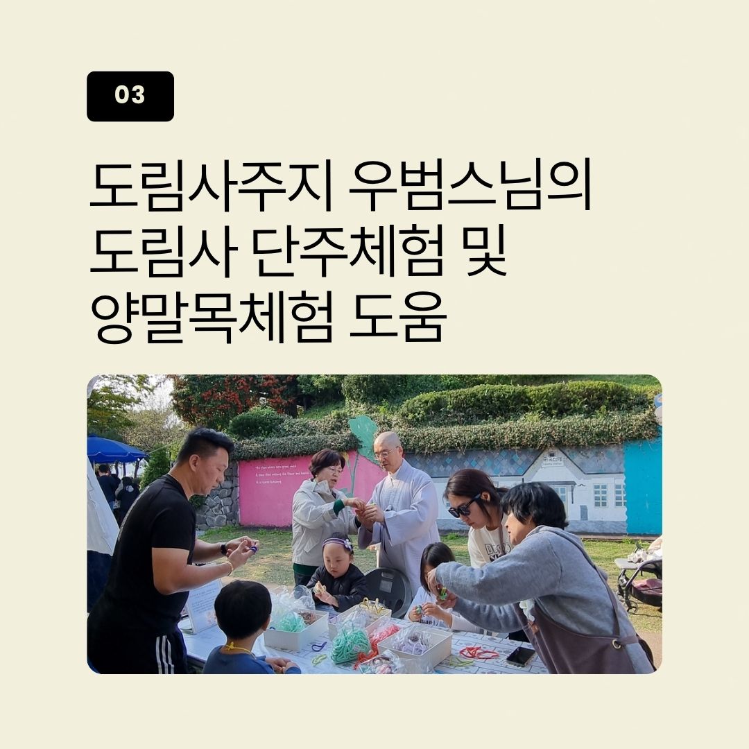 -단주 만들기: 전통적인 재료와 방식으로 단주(염주)를 직접 만들어보는 체험은 아이들에게는 흥미로운 문화 체험을, 어른들에게는 정서적 안정과 소망을 담는 의미 있는 시간을 선사했다.