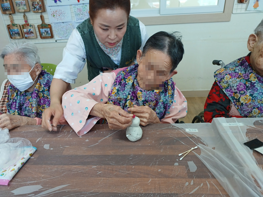 직원들의 자체 난타공연을 통해 흥겨운 분위기를 조성하였으며, 활동 프로그램 으로는 지점토를 활용한 눈사람 만들기 활동을 진행하여 어르신들의 소근육 활동과 참여를 도모하였습니다.
