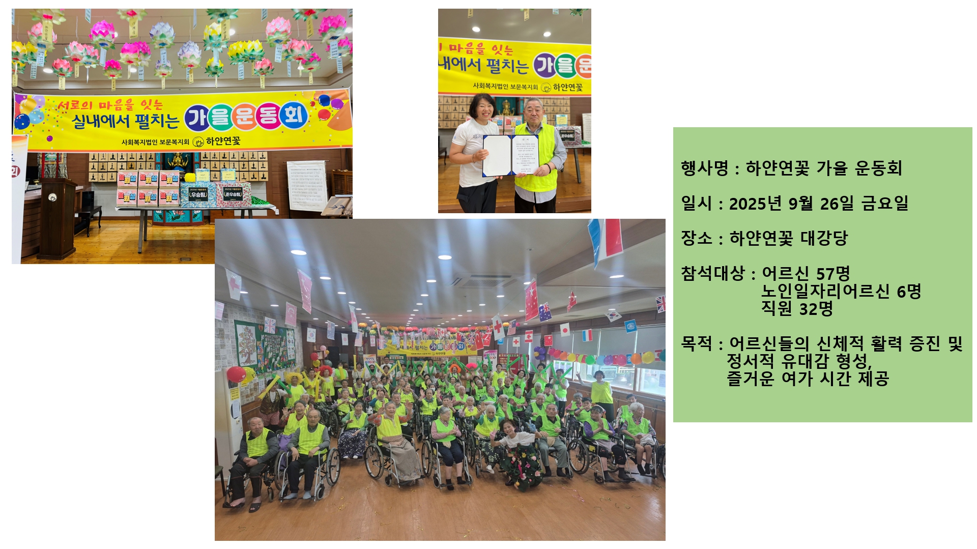 이번 실내운동회은 어르신들의 신체적, 정신적 건강 증진에 크게 기여하였으며, 앞으로도 흥미롭고 안전한 프로그램을 지속적으로 제공할 계획입니다.