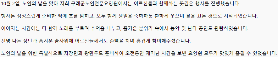 [구례군노인전문요양원] 25년 노인의 날 행사 페이지 정보 작성자 보문복지회 작성일25-10-02 12:07 조회22회 댓글0건 본문 댓글목록 등록된 댓글이 없습니다. 이전글 다음글 목록