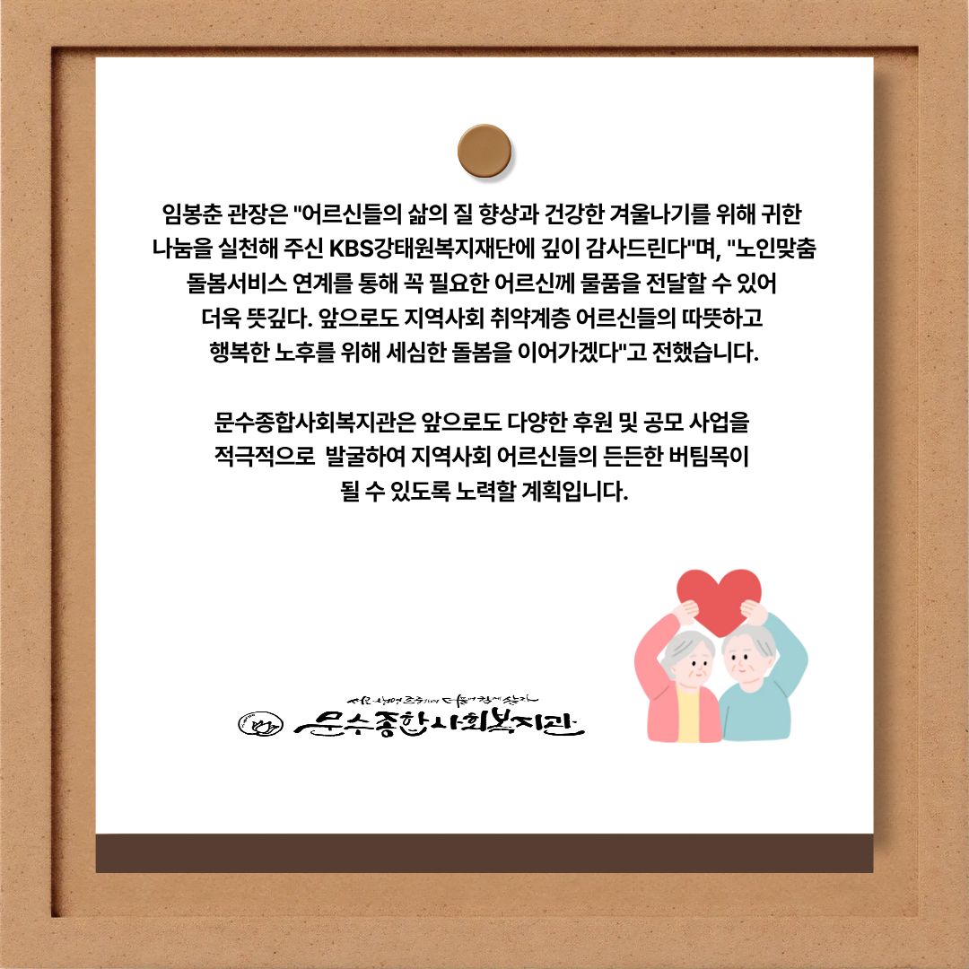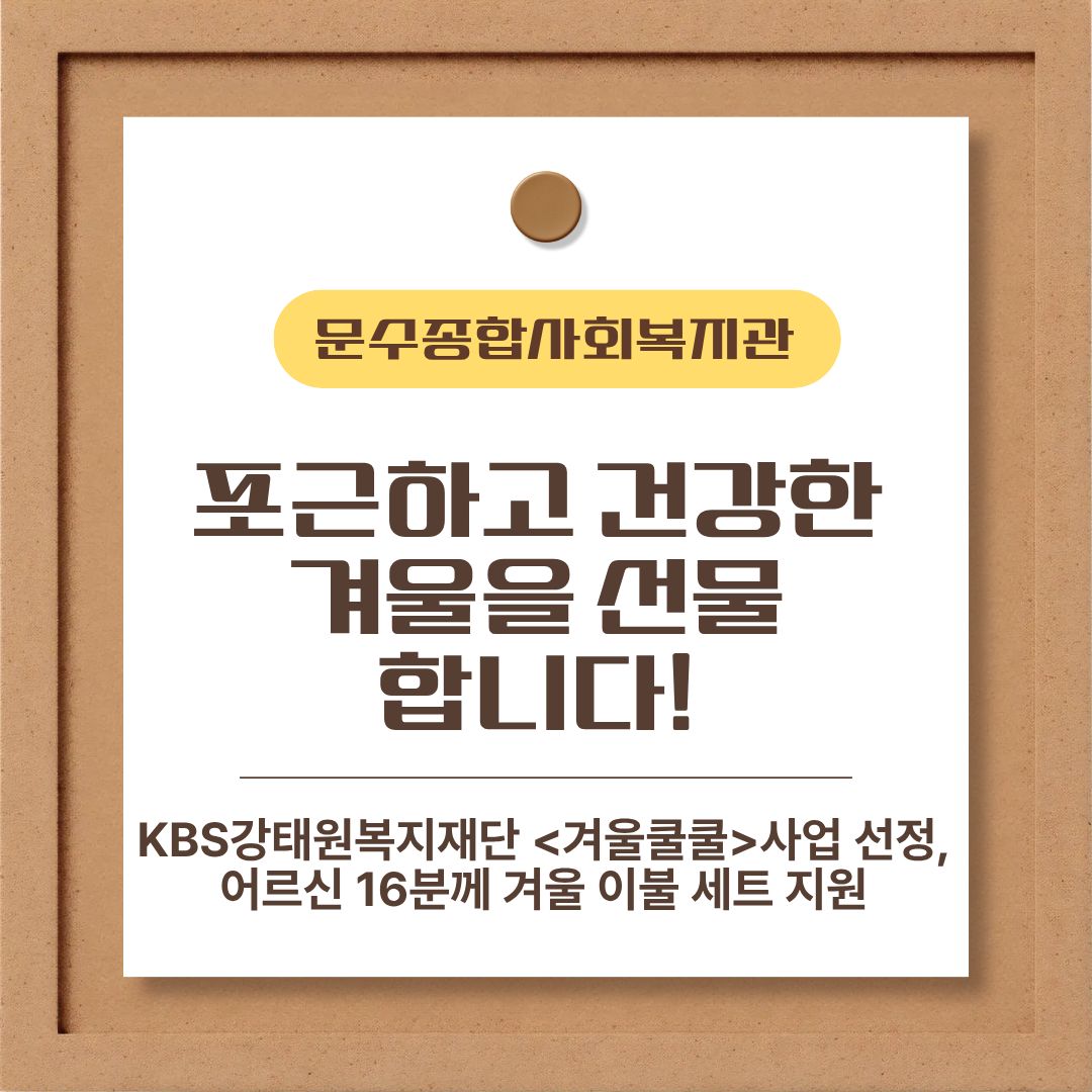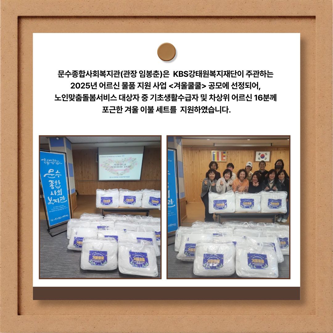 [문수종합사회복지관] 포근하고 건강한 겨울을 선물합니다! 페이지 정보 작성자 보문복지회 작성일25-11-11 14:47 조회35회 댓글0건 본문 댓글목록 등록된 댓글이 없습니다. 이전글 다음글 목록