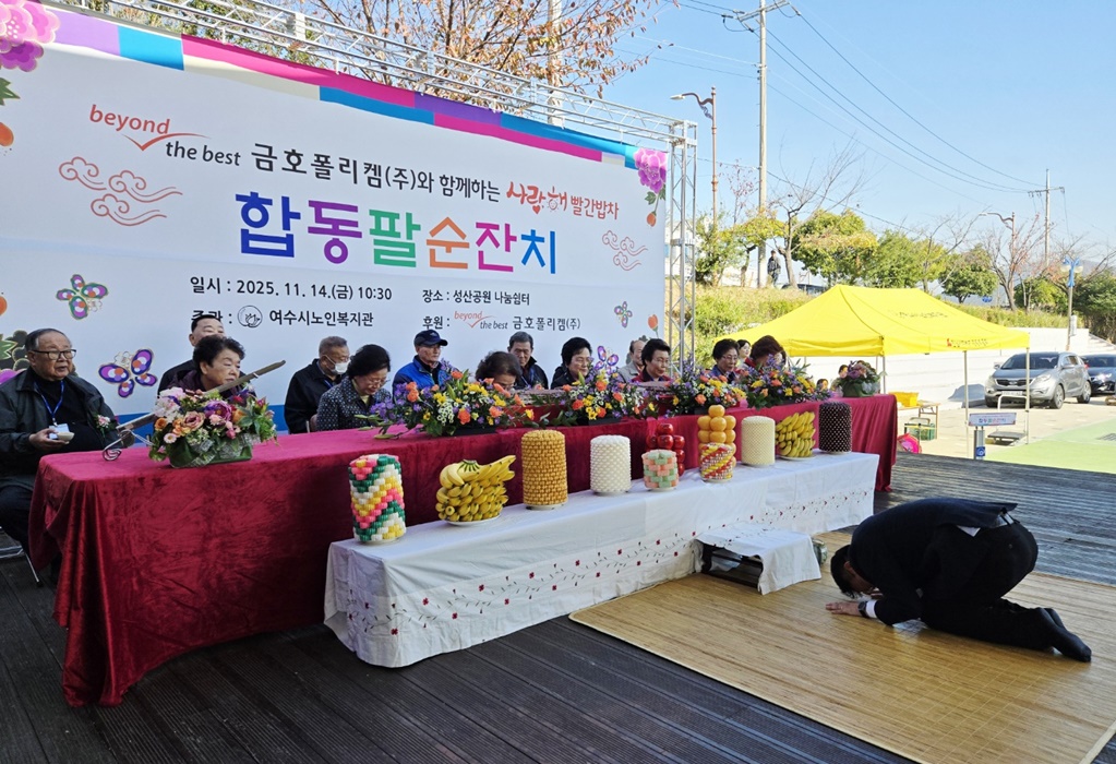 여수시노인복지관은 금호폴리켐 여수공장(공장장 최영선)과 함께 11월 14일 여천동 성산공원 나눔쉼터에서 합동 팔순잔치를 열었습니다.