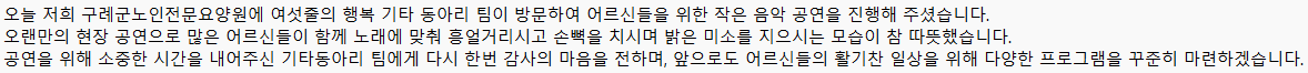 [구례군노인전문요양원] 여섯줄의 행복 기타동아리 방문 공연 페이지 정보 작성자 보문복지회 작성일25-12-10 16:17 조회24회 댓글0건 본문 댓글목록 등록된 댓글이 없습니다. 이전글 다음글 목록